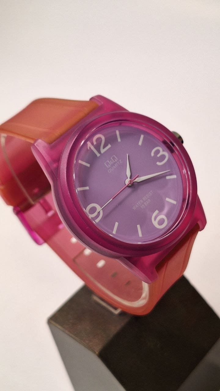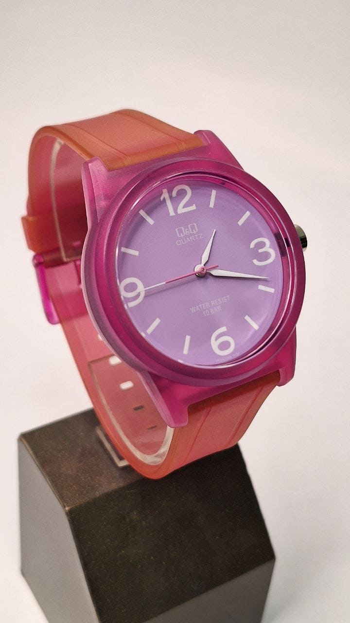 ساعت مچی اسپرت کیو اند کیو (Q&Q) با صفحه آبی و صورتی، بند سیلیکونی