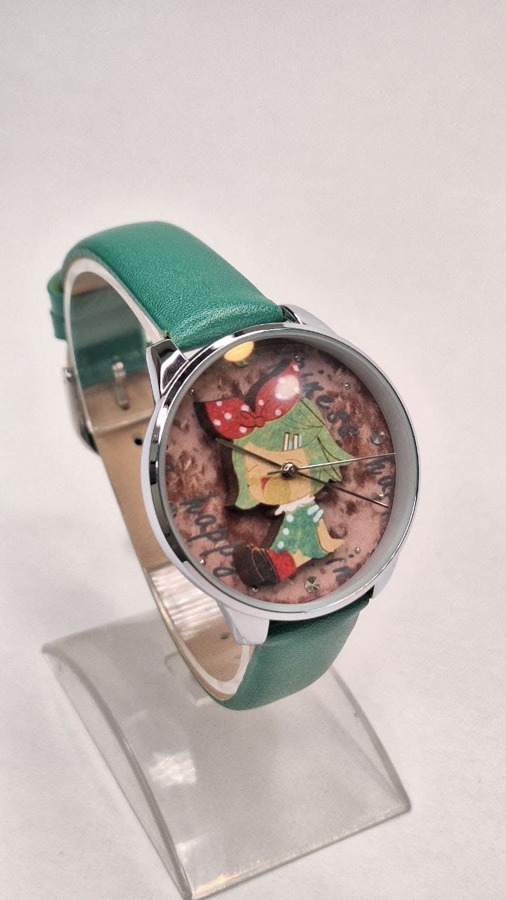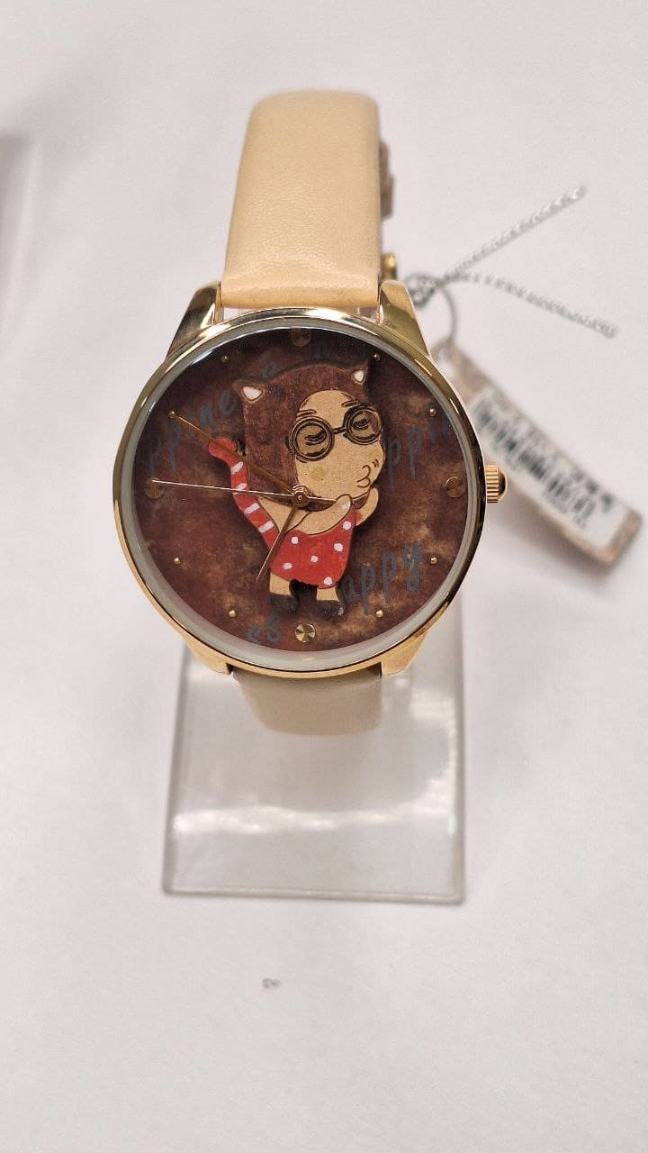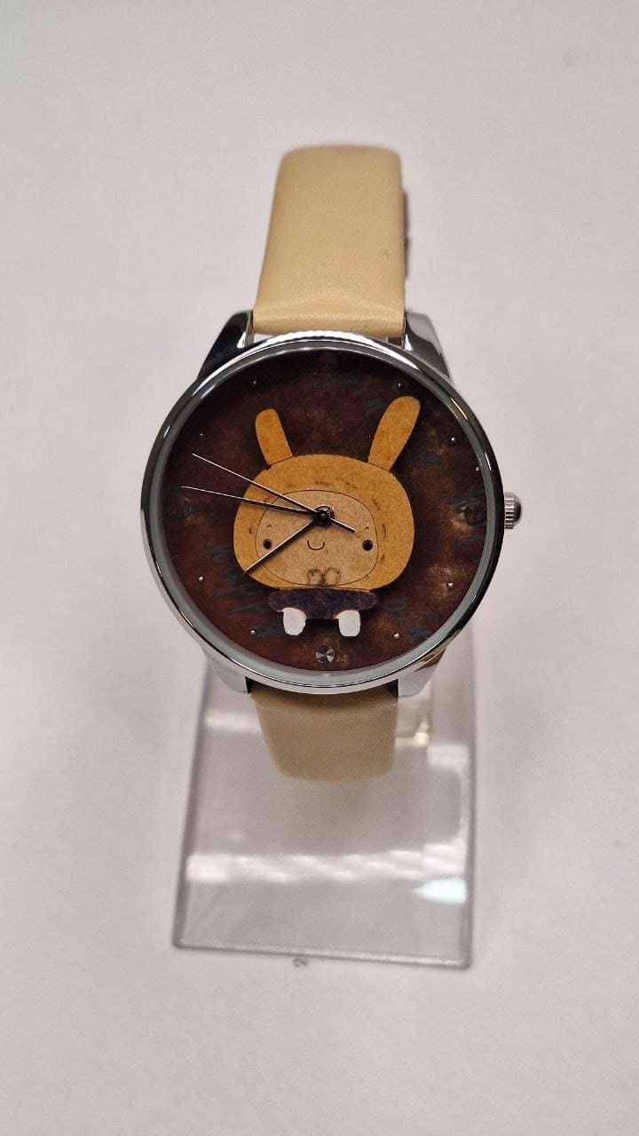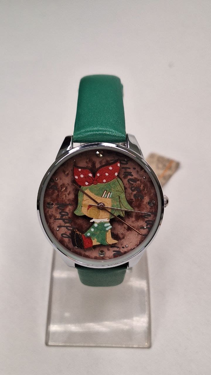 ساعت مچی عروسکی دستساز با بدنه فلزی سبک، بند چرم مصنوعی و شیشه کاس زرهبینی مقاوم. طراحی هنری و خاص، مناسب هدیه با جعبه لوکس. گارانتی ۱ ساله موتور.